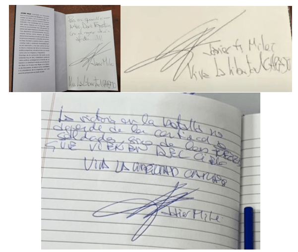 Se solicita a nuestro sistema robotizado de Inteligencia Artificial EA-BOT entrenado en Criminalística y en concreto en Pericia Caligráfica y Psicografológica, que realice un análisis psicografológico de Javier Milei a partir de varios documentos manuscritos atribuidos a dicha persona. El sistema emite sus conclusiones de forma autónoma y objetiva.